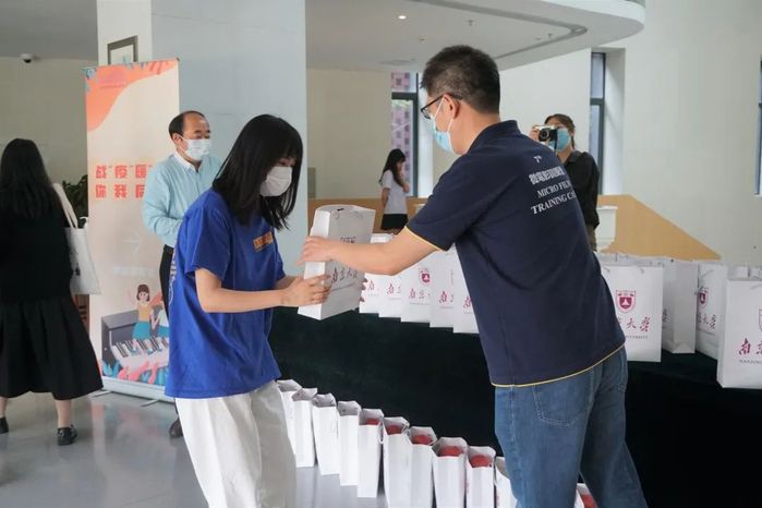 阳光正好,微风不燥,绿草如茵,春意盎然。下午四点半,新传学子陆续到达紫金楼。院门前,老师和志愿者满怀笑意地迎接着他们。伴随着悠扬动听的钢琴演奏,新传学子在展台志愿者们热情而欢乐的引导下领取慰问物资,签写签收表。