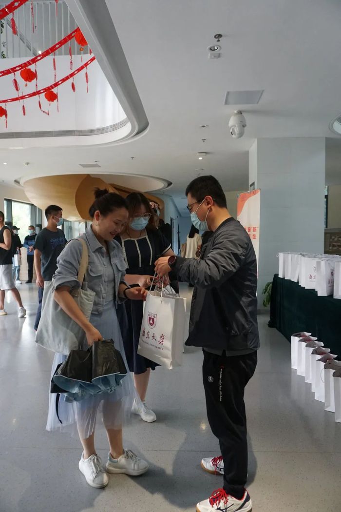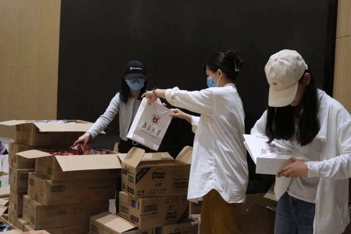在指导老师和同学的共同合作之下,抗疫物资整齐地排列在紫金楼大厅的展台上,等待着新传同学的到来。四四方方的礼品袋,印着我们熟悉的南大校徽,装满了精心挑选的抗疫物资,承载着学院对同学们真挚的关心和祝愿。