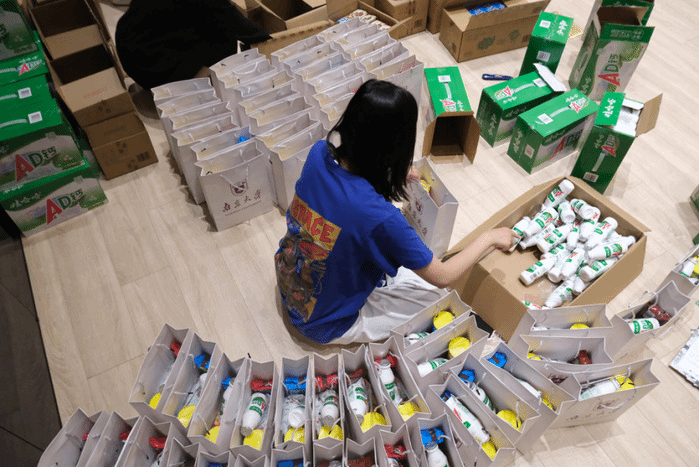 将一箱箱慰问品拆封垒好,盛装的袋子在“薯片负责人”“趣多多负责人”“哇哈哈负责人”等等的手中传递,讲台瞬间变成“流水线工作台”。“战”疫暖“新”,看着大厅中整齐摆好的袋子,心里成就感满满,也暖暖的~