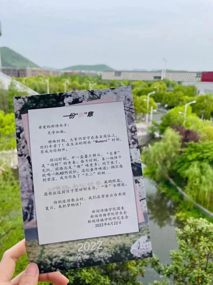 昨天在班群里看到通知:新传院给院系同学(包括我们大一传媒实验班的同学)准备了物资,让我们前去领取。我们都特别惊喜,目前属于“秉文书院”的我们,居然也能收到来自新传院的关怀。我和同学一起走到院楼,大厅里的老师笑吟吟地和我们打招呼。沉甸甸的袋子里还放着一份“新”意——一封来自新传的信。见字如面,殷殷真情,我永远会被文字的力量打动。