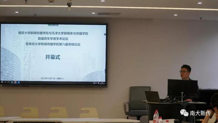 副院长胡翼青教授发表致辞。他对各位老师不辞辛苦坚持参会的行动表示了感谢,对连续举办了八届的青椒论坛的深厚传统表示了肯定,并认为此次论坛对南大和天大都具有里程碑式的意义。通过对自己亲身经历的分享,胡翼青教授强调了青年学者间交流与对话的重要性。他希望这次论坛体现出两点风采,第一是任何学者之间都能平等对话,第二是评议人点评不留情面,以帮助青年教师更快成长,希望各位青椒能在丰富的日程安排和激烈的对谈交锋中享受学术的快乐。