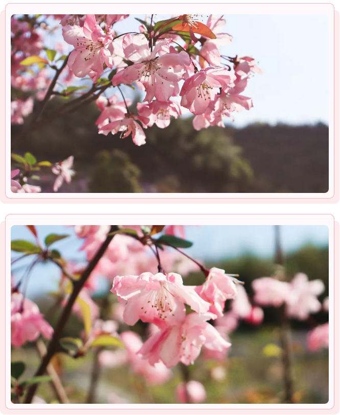 海棠无香,却妖冶美丽,近处看她,低垂在枝头,有种清冷的气质,远处看像一颗大绒球,一颤一颤的,挡不住她撩拨心弦的可爱。