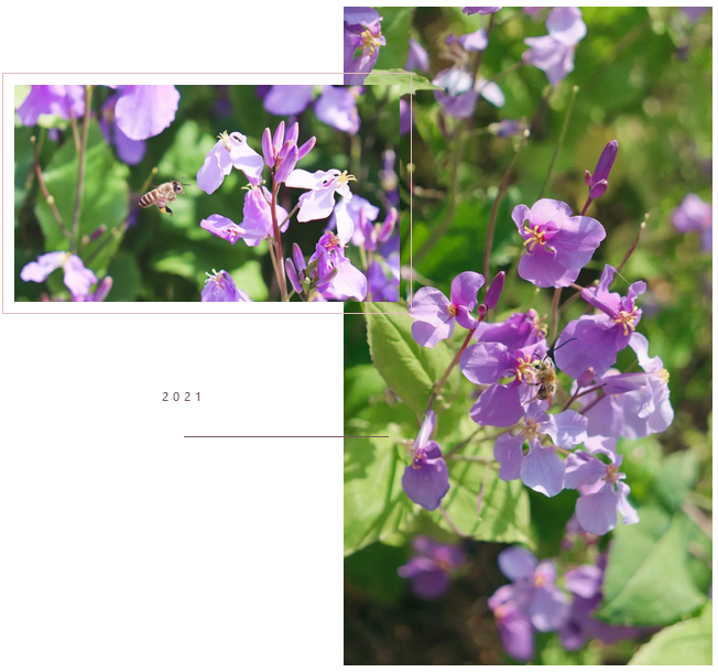 紫色的二月兰,在山脚下蔓延,生机盎然的同时又添三分迷离、七分静谧,走近能嗅到淡淡的幽香,还有蜜蜂在上面驻足停留。