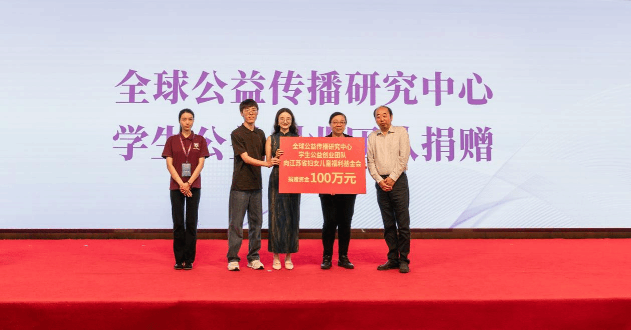 活动现场,全球公益传播研究中心学生公益创业团队代表向江苏省妇儿基金会副理事长兼秘书长顾敏递交100万元捐赠牌,继续支持公益事业。