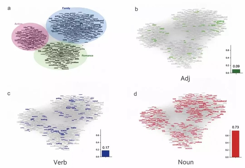 图4: 男性为主电影的词共现网络。a使用Q-modularity识别出来的五个社区。b,c,d分别是形容词、动词和名词的分布。