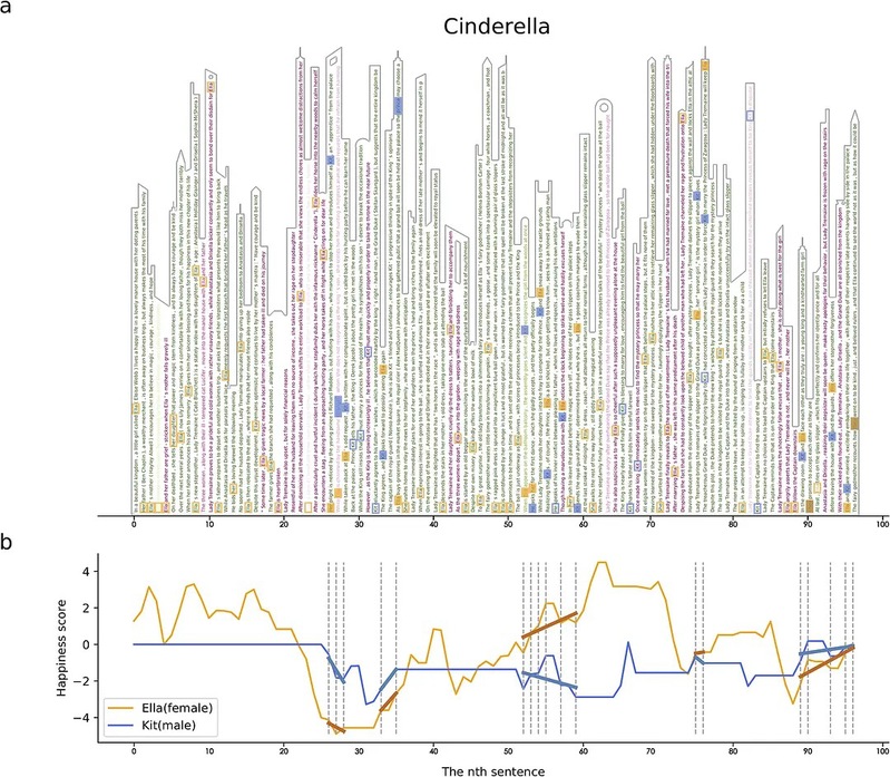 图1:《Cinderella(灰姑娘)》句子以垂直方式显示,文本颜色代表快乐(绿色)或不快乐(红色)。通过名字的突出显示,Ella(灰姑娘,橙色)和Kit(王子,蓝色)在同一个句子中同时出现。