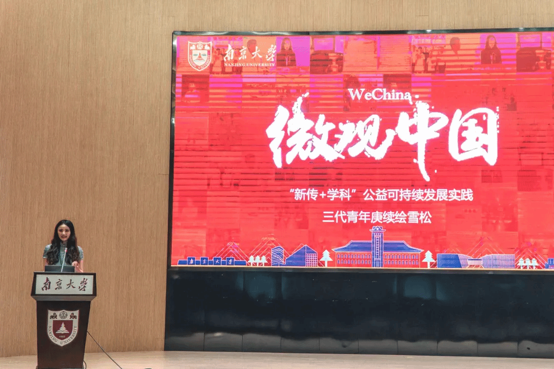 随后,黄玺澄做了“微观中国”公益项目汇报,现场讲述了三代南大青年以“新传+学科”、“新传+青年”为模式的奋斗故事,他们共同探索“解困、育人、成才、回馈”可持续发展公益循环,以奋进的姿态开展研究与实践,在宏大叙事里找到微观中国。