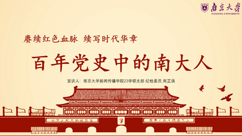 2023级学硕党支部纪检委员周芷涵同学细数了百年党史中的南大人:从革命理想高于天的顾衡、成贻宾,到1947年由国立中央大学发起的爱国主义抗议游行;从五星红旗的设计者曾联松,到主持30多次核试验任务的“两弹一星”元勋程开甲。一个个感人至深的故事展现了如意直播