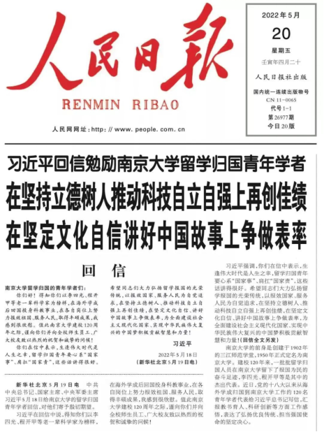 的关注、关心和关爱。这封回信是南大百廿校庆的最好礼物,它深刻镌刻在全体南大师生的心中,令我们感到无比骄傲和自豪。在新百廿的新起点上,我们将认真学习宣传贯彻习近平总书记重要回信精神,对“国之大者”了然于胸,对“党之大计,国之大计”心中有数,做好党的政策主张传播者,时代风云记录者,社会进步推动者,公平正义守望者,以报效国家,服务人民为自觉追求,书写和传播思想高度、历史厚度和情感温度的新时代中国故事,以实际行动迎接党的二十大胜利召开。