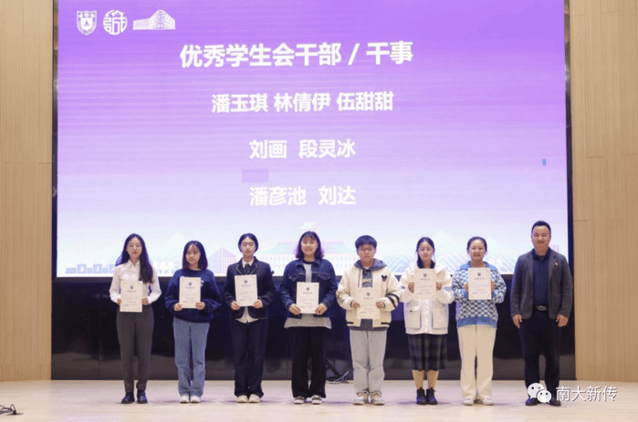 团学组织评优的7位优秀学生会干部、干事进行表彰,院团委书记吴平老师为其颁发证书。