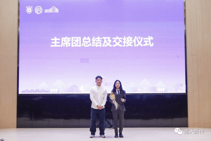第二次学生代表大会选举产生的新一届主席团成员进行交接仪式。执行主席黄麒霖表示,过去一年,团学联不断建设并取得了一定成绩,感谢院党委的关心和团委的指导,也感谢主席团成员及团学联所有成员的付出,也期望团学联越来越好、期望同学们未来都能在各自的发展领域大放异彩。黄麒霖对当选新一届团学联执行主席的潘玉琪进行祝贺,送上了一束代表传承的鲜花,和一本有老师和上届主席团深情寄语的笔记本,并表达了对未来团学工作开展的美好祝愿。