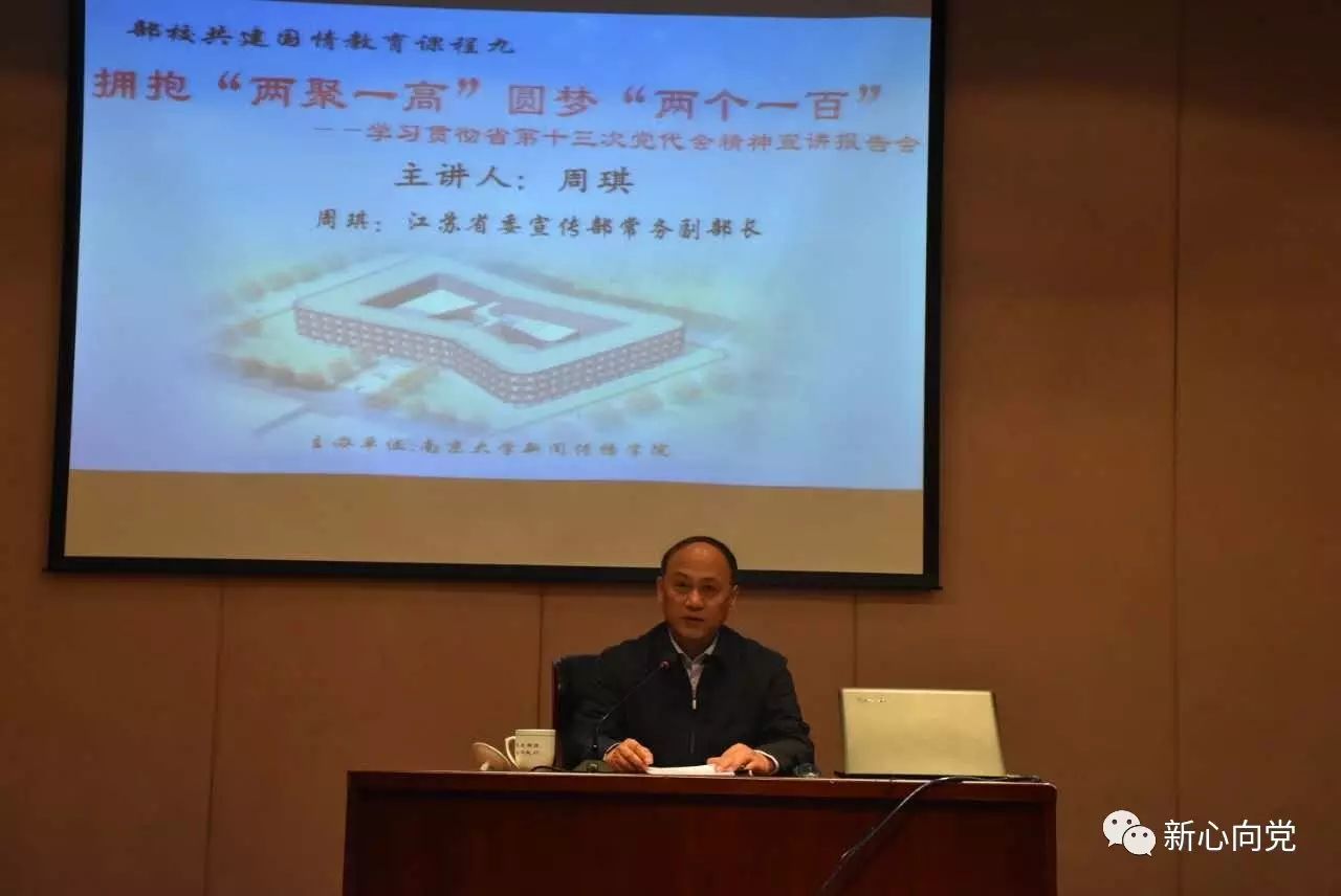 周琪副部长指出,中国共产党江苏省第十三次代表大会于11月18日至22日在南京隆重召开。这次党代会是在全面建成小康社会的决胜阶段,推动大会迈上新台阶建设新江苏的关键时期召开的一次十分重要的会议,大会作出了聚力创新、聚焦富民、高水平全面建设小康社会的重大部署。他从一高、两聚、党建和寄语四个方面,对省第十三次党代会精神进行了全面阐释。