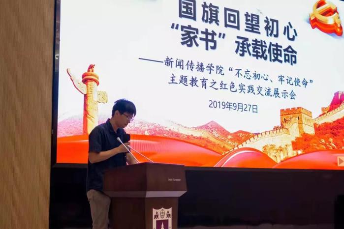 纪录片主创代表、2018级硕士研究生王瑜显分享创作初衷和感想体会。曾松联校友并非美术或设计专业出身,而是毕业于经济专业,喜欢书法和作诗。考上国立中央大学之后,由于“七七事变”爆发,他跟随学校一路西迁到重庆。曾松联校友的求学之路与国家战火平行、和国家命运同呼吸,设计国旗其实是在表达自己对国家的深爱和对未来的期望。这部纪录片是南大新传人给新中国七十华诞的献礼,让同学们更加深刻地理解了作为国之栋梁所肩负的责任和使命。