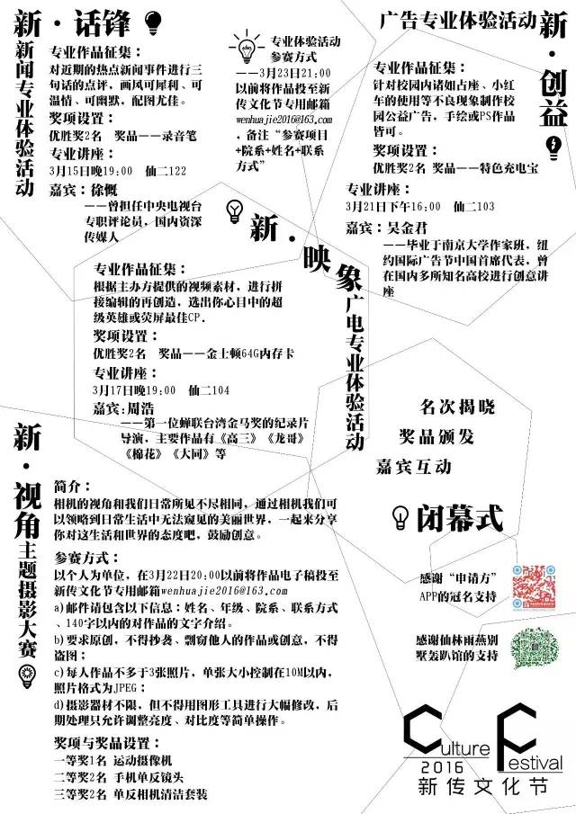 Ps:截稿后所有作品由新传学生会整理汇总,专业老师打分占60%,学生代表打分占40%。评比结果于325日在微新传上公布(并和获奖者本人联系),奖项将于326日的闭幕式上颁发。