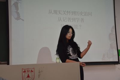 学生记者团进行的调查报道活动,例如行走淮河报道,安徽百户农民秋收报告。报道深刻而真实的记录了中国农民的生活百态,高度的人文关怀,悲悯但客观的新闻态度,打动了在场的每一颗热切的赤子之心。随后她又介绍了苏北化工区调查,四川震后百日调查,三江源环保与移民生态调查等,从一帧帧新闻现场的画面和海燕老师专业冷静的解说中,同学们逐步认识到新闻应最大程度地逼近真实,以及批判性思维和质疑精神在新闻人的职业生涯中是多么重要。她告诉新生,心灵的成长意味着懂得成为怎样的人、懂得以什么样的态度去观察世界、懂得以何种方式判断并行动。