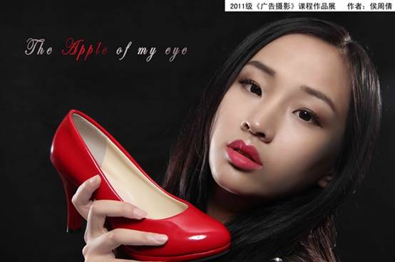 you’re the apple of my eye用来形容“最珍贵的人”,在这幅广告作品中,以此为广告词,表现该品牌高跟鞋是每个女人眼中的珍贵,也喻指穿高跟鞋的人是最珍贵的。红皮鞋鲜红靓丽的颜色,也仿佛是apple的化身,也与模特的唇色相呼应。