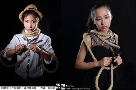 这是为WWF保护野生动物主题创作的一副广告摄影作品。你看,人类在用餐享受他们的美食,但是闪着锋利光芒的刀叉连着绳子一端,绳子的另一端连着他们的脖颈,吃下盘中的美食,最后勒死的却是他们自己。这是一桩令人意想不到的谋杀,却也只有“保护野生动物”才能阻止犯罪。无论你是冷酷无情还是满含慈悲,都请放下“屠刀”,立地成“佛”。