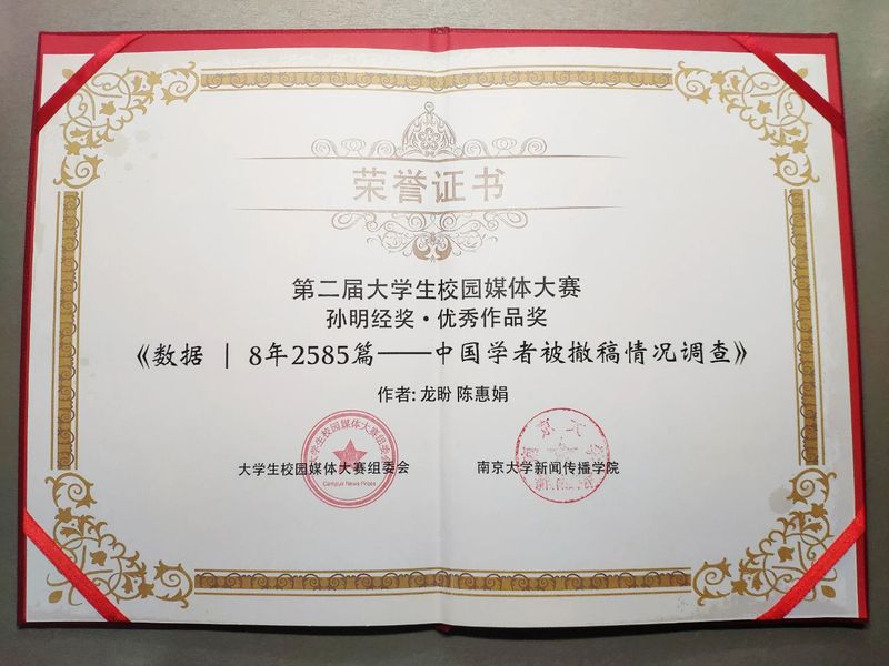 18级本科生龙盼、陈惠娟同学报道《数据 | 8年2585篇——中国学者被撤稿情况调查》荣获数据新闻类奖项,如意直播