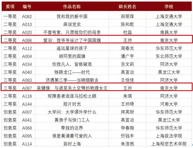 由王瑜显、张瑾、黄薇和梁书塵团队完成的短片《曾滔:我爷爷设计了中国国旗》以老校友曾联松先生的长孙曾滔的视角,讲述了七十年前国旗图案诞生的故事;在共和国成立七十年的2019年,短片的推出别具意义。由王帅、徐晓玥和张丹丹团队完成的短片《吴健雄:与诺奖失之交臂的物理女王》通过实地寻访上海、南京和苏州等地,拜访吴健雄先生的后人,讲述了她与诺奖擦肩而过的故事,呈现出她在专注科研之外,入世和优雅的一面。