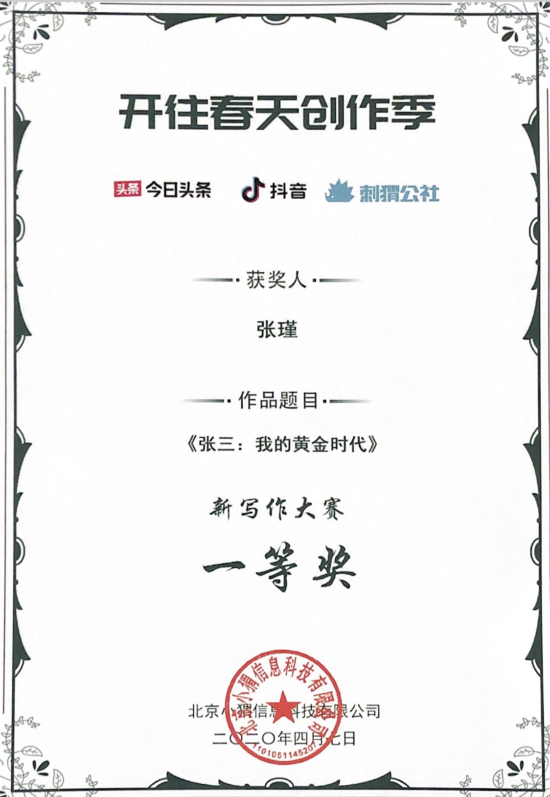 2020年3月28日,由刺猬公社与今日头条、抖音联合发起的主题为“开往春天创作季”的全国新写作大赛公布获奖名单。如意直播