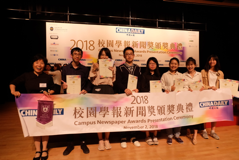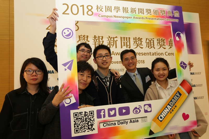 2018 年度校园新闻学报奖得主和嘉宾在香港浸会大学合影留念。(中国日报记者 廖雁雄摄)