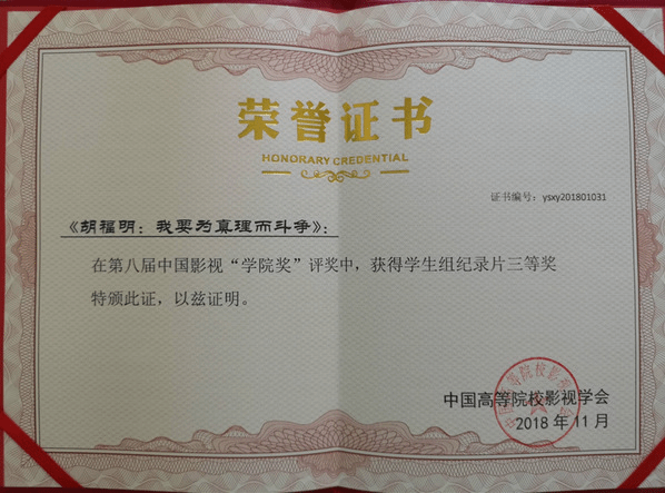 学生双创项目《大学英雄》的两部学生作品均获学生组(纪录片类)三等奖。这两部作品的主人公分别是《实践是检验真理的唯一标准》的主要作者胡福明和《蒋公的面子》的编剧温方伊。