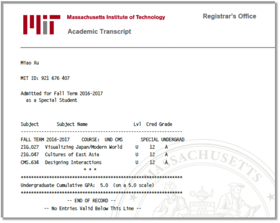 (徐妙在麻省理工大学交换时的成绩单)