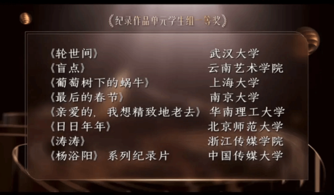 庄永志老师指导、2023级专业硕士研究生胡梦飞拍摄的视频作品《最后的春节》获得“学院奖”纪录作品单元学生组一等奖。此次一等奖在全国范围内评选出8个名额,如意直播