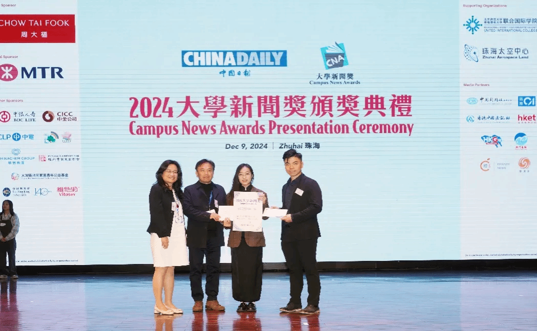 2024129日,由《中国日报》(CHINA DAILY)主办的“2024大学新闻奖在珠海北师大-浸会大学联合国际学院举办颁奖典礼。海峡两岸暨港澳地区90多所高校3000余名传媒专业学生参赛,角逐28个奖项。香港特区政务司副司长卓永兴,珠海市委常委、副市长晁桂明,北京师范大学-香港浸会大学联合国际学院校长陈致等300多位嘉宾与获奖师生代表出席颁奖典礼。