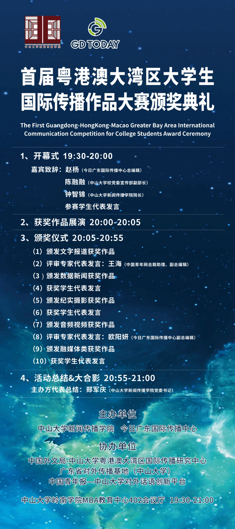 、今日广东国际传播中心联合举办的“首届粤港澳大湾区大学生国际传播作品大赛”颁奖典礼于中山大学广州校区举行,50支获奖团队到场领奖,20余位业界、学界嘉宾出席颁奖典礼,为获奖团队颁奖并作点评发言。