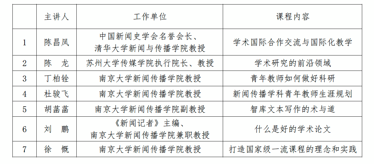 本期暑期学校将以线下方式进行,活动内容包括学术讲座、授课心得分享、研究计划和授课计划发表等。届时将邀请国内知名学者、新闻传播国家级精品课程主讲教师和C刊主编与各位学员深度交流,优秀论文将优先推荐到《传媒观察》《新闻记者》《中国网络传播研究》等刊物发表。